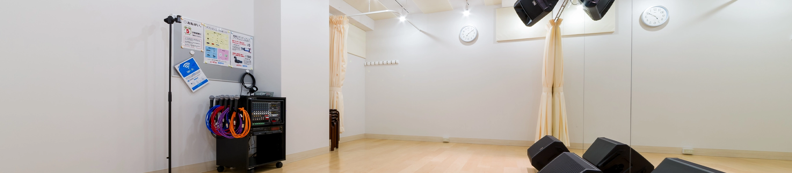 アカペラを主とした複数名でのマイクを使った演奏に特化した防音室です。6名前後のメンバーが横一列に並んで歌う事を想定しており、正面には一面の鏡と天井左右に配備されたスピーカーより音の確認が頂けます。 また、足元にはくっきりと音の確認が出来るように専用にモニターも配備。完璧なリスニング空間を実現しました。お持ち込みのプレイヤー(スマホやmp3プレイヤー等)での再生、専用機器を使った簡易録音、動画撮影にも最適な空間となっております。