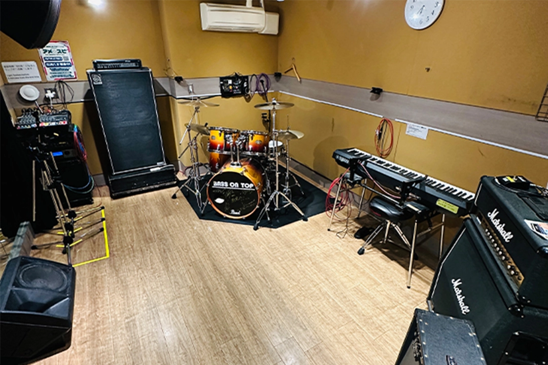 Pearlドラムセット/Ampegベースアンプ/YAMAHA電子ピアノ設置・広さ12帖。向かい合った形での練習にオススメ。