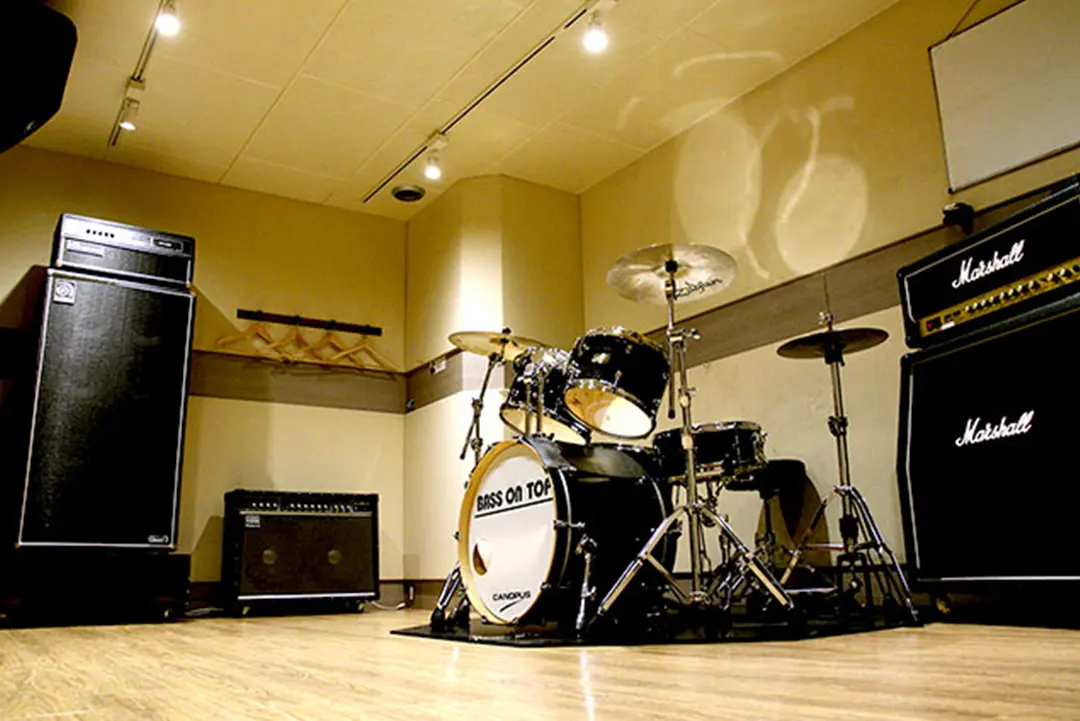 CANOPUSドラムセット/Ampegベースアンプ・広さ12帖。 ライブステージを意識した作りになっており、ライブバンドにオススメ!
