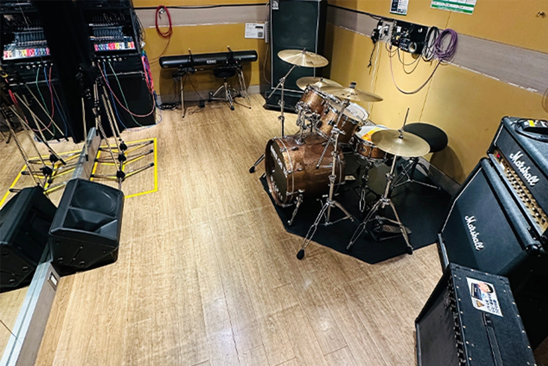 SAKAEドラムセット/Ampegベースアンプ/電子ピアノ設置・広さ12帖。 ライブステージを意識した作りになっており、ライブバンドにオススメ!