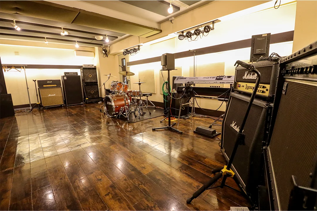4帖の控室も合わせて30帖!SONOR、Aguilarなどのハイスペック機材常設! 当店で一番広い部屋で、演奏することの楽しさをどこまでも追及した極上のスタジオです。ブースは26帖となっており、大人数のバンドやビッグバンドも安心してご利用できます。また、鏡も設置してあるためダンス練習としてもご利用頂いております。この広さを利用したセッションイベントが開催されるなど、様々なスタイルに対応した人気のスタジオです。