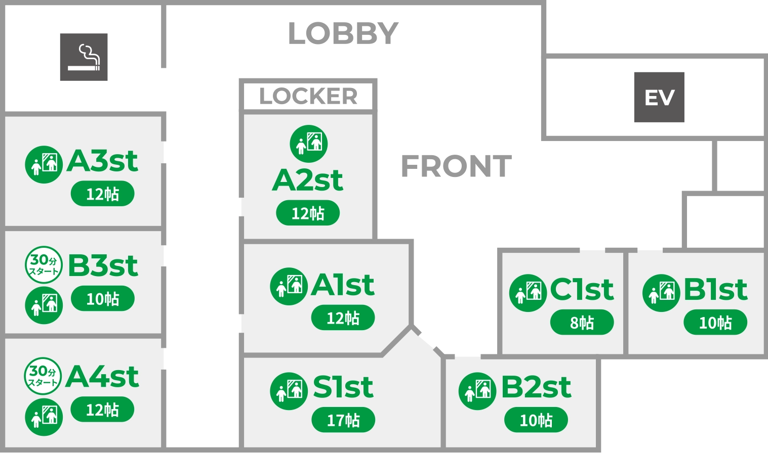 ※「30分スタート」のアイコンがない部屋については「00分スタート」になります。