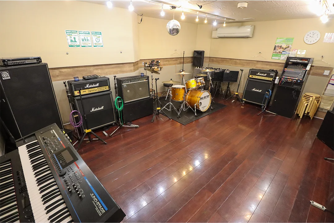 ROLAND RD800(エレピ)常設。追加シンセサイザー無料。Marshallスタックアンプ2台常設。音抜け最高のCANOPUSドラムを導入しています。