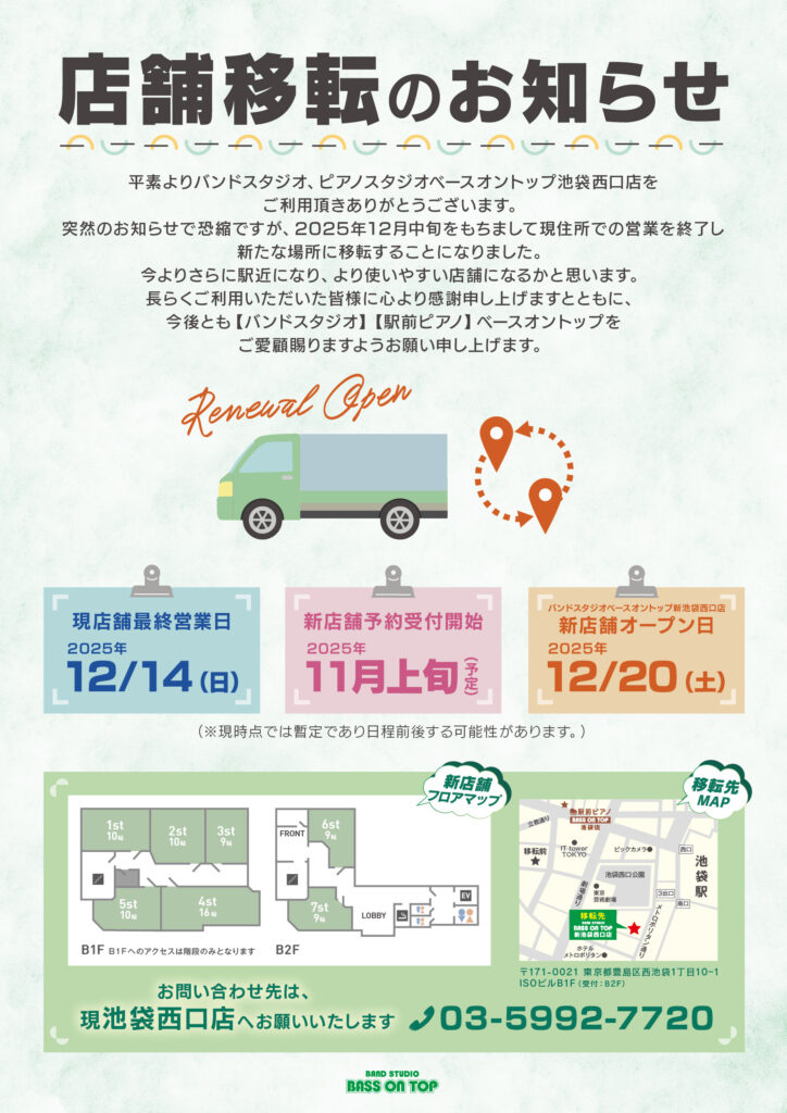 025年12月中旬をもちまして現住所での営業を終了し新たな場所に移転することになりました。今後とも【バンドスタジオ】【駅前ピアノ】ベースオントップをご愛顧賜りますようお願い申し上げます。
