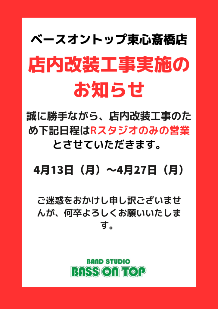 【東心斎橋店】店内改装工事 実施のお知らせ