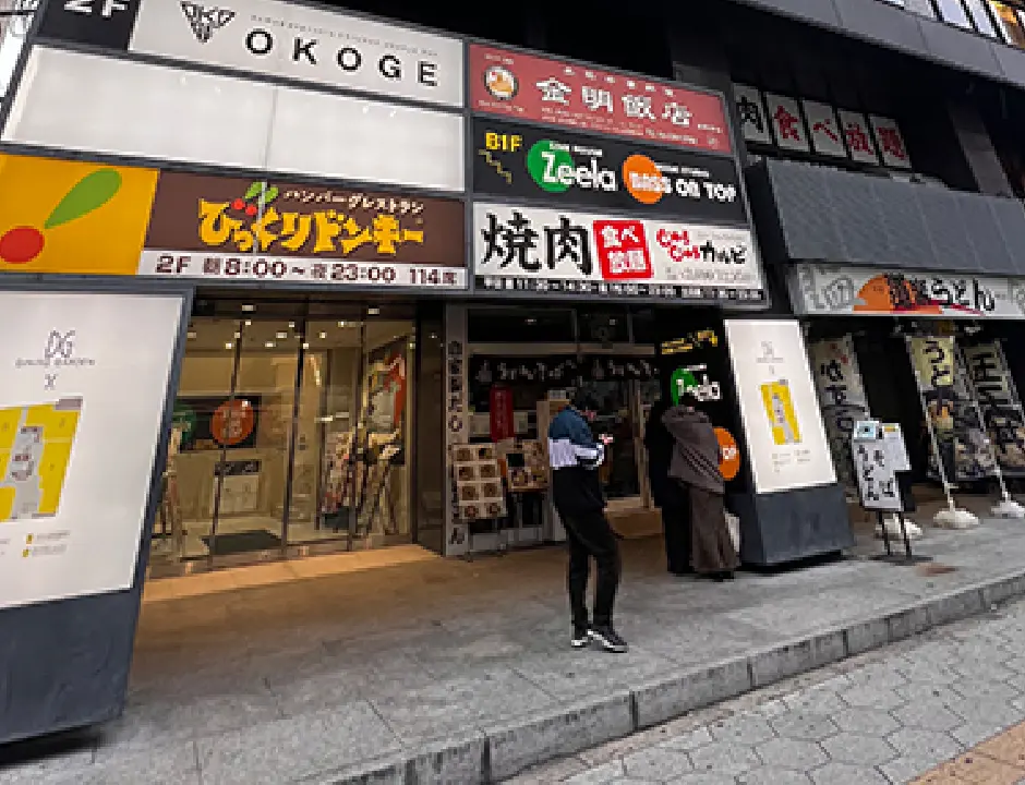 ・100m程進み右手に見えるローソン横の黒い大きなビルのB1F