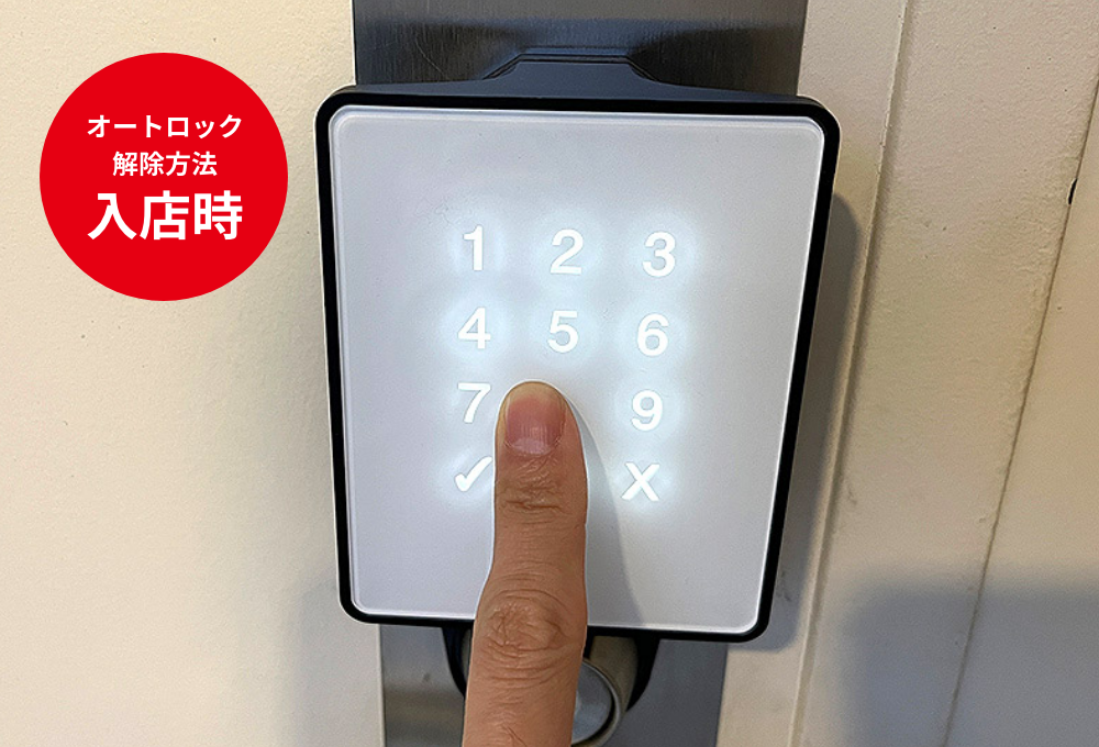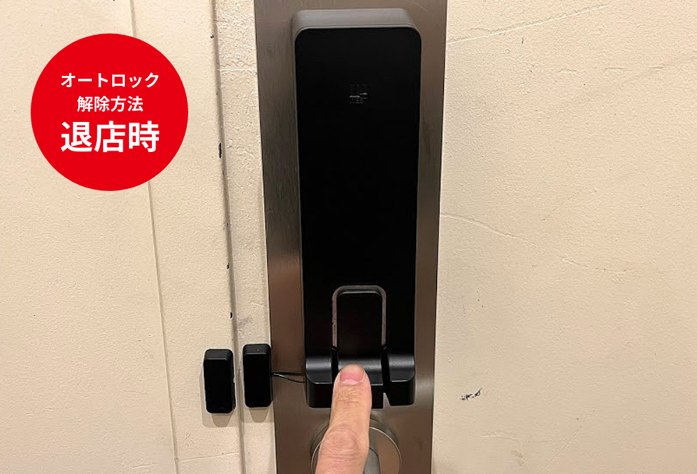 - 店内側の扉ノブ上にある端末のレバーを下に引くと解錠