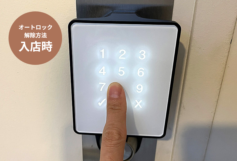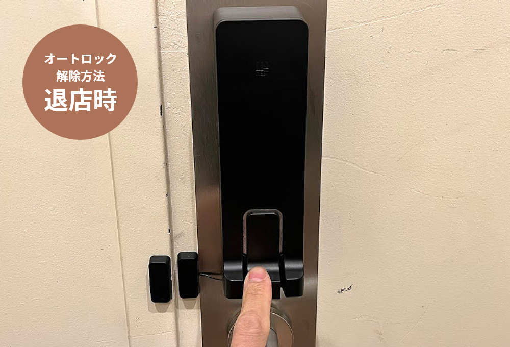 - 店内側の扉ノブ上にある端末のレバーを下に引くと解錠