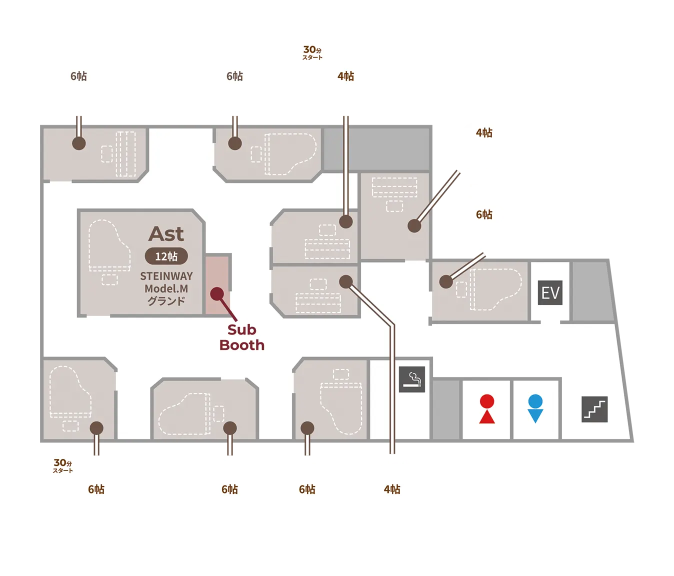 喫煙室を完備した、ピアノスタジオご利用者様専用ロビーをご用意しておりますので、喫煙者様も非喫煙者様もごゆっくり休憩していただけます。